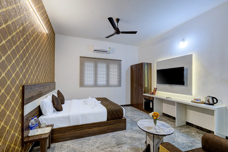 Spacious Air Conditioned Apartments with one living room with Sofas. One Deluxe Bedroom with a King Size Bed. This deluxe room has a Bathroom with a walk-in shower and complimentary toiletries. On request Kitchenette items like Microwave Oven, Induction, Kettle, Toaster, Refrigerator, Kitchenware, and Aqua Guard water purifier.