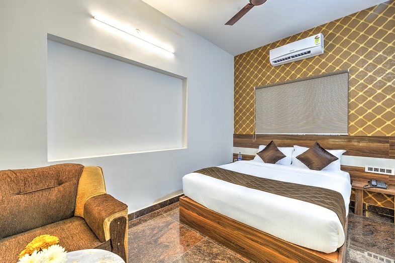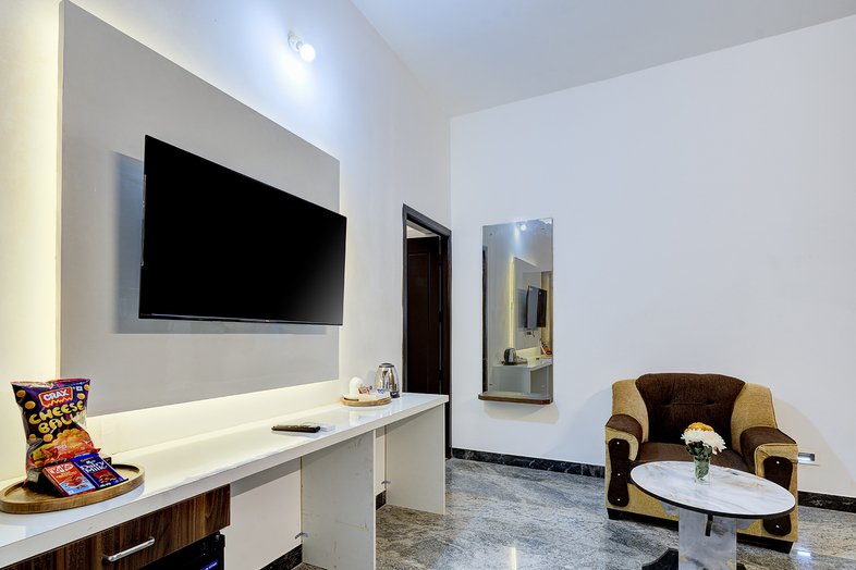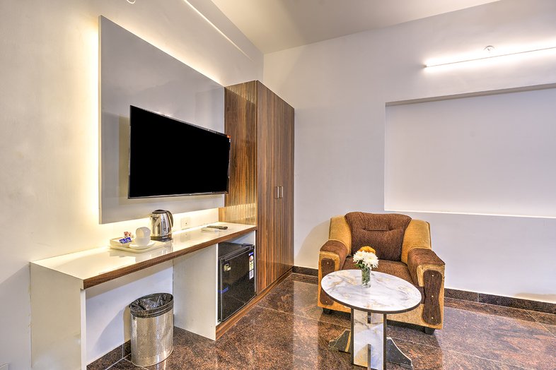 Spacious Air Conditioned Apartments with one living room with Sofas. One Deluxe Bedroom with a King Size Bed. This deluxe room has a Bathroom with a walk-in shower and complimentary toiletries. On request Kitchenette items like Microwave Oven, Induction, Kettle, Toaster, Refrigerator, Kitchenware, and Aqua Guard water purifier.